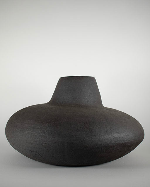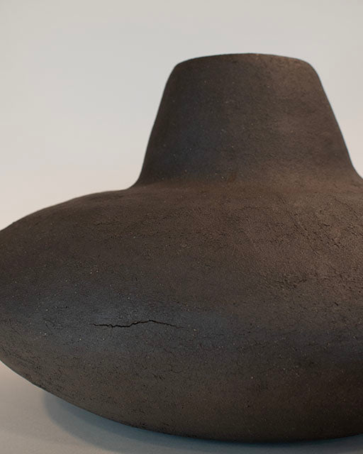 Hand-built with black stoneware coils, which fires black with light specks in most lights, but sometimes looks very dark brown. The interior is glazed clear. Watertight.