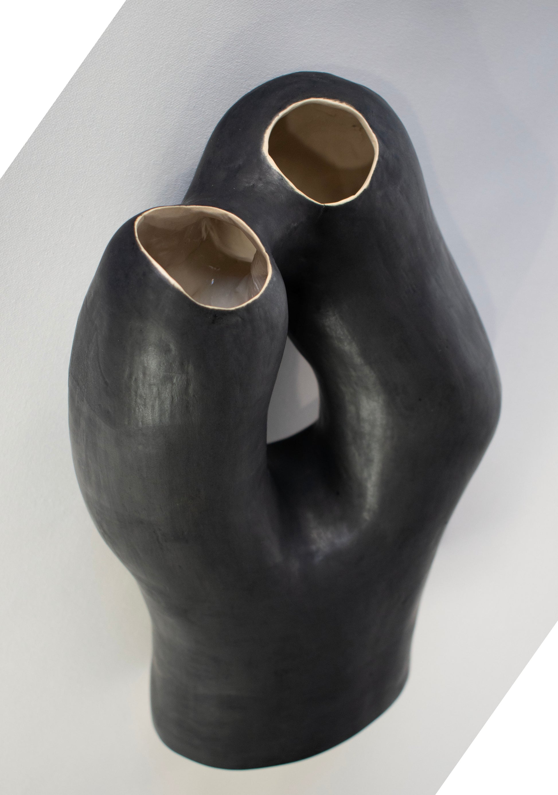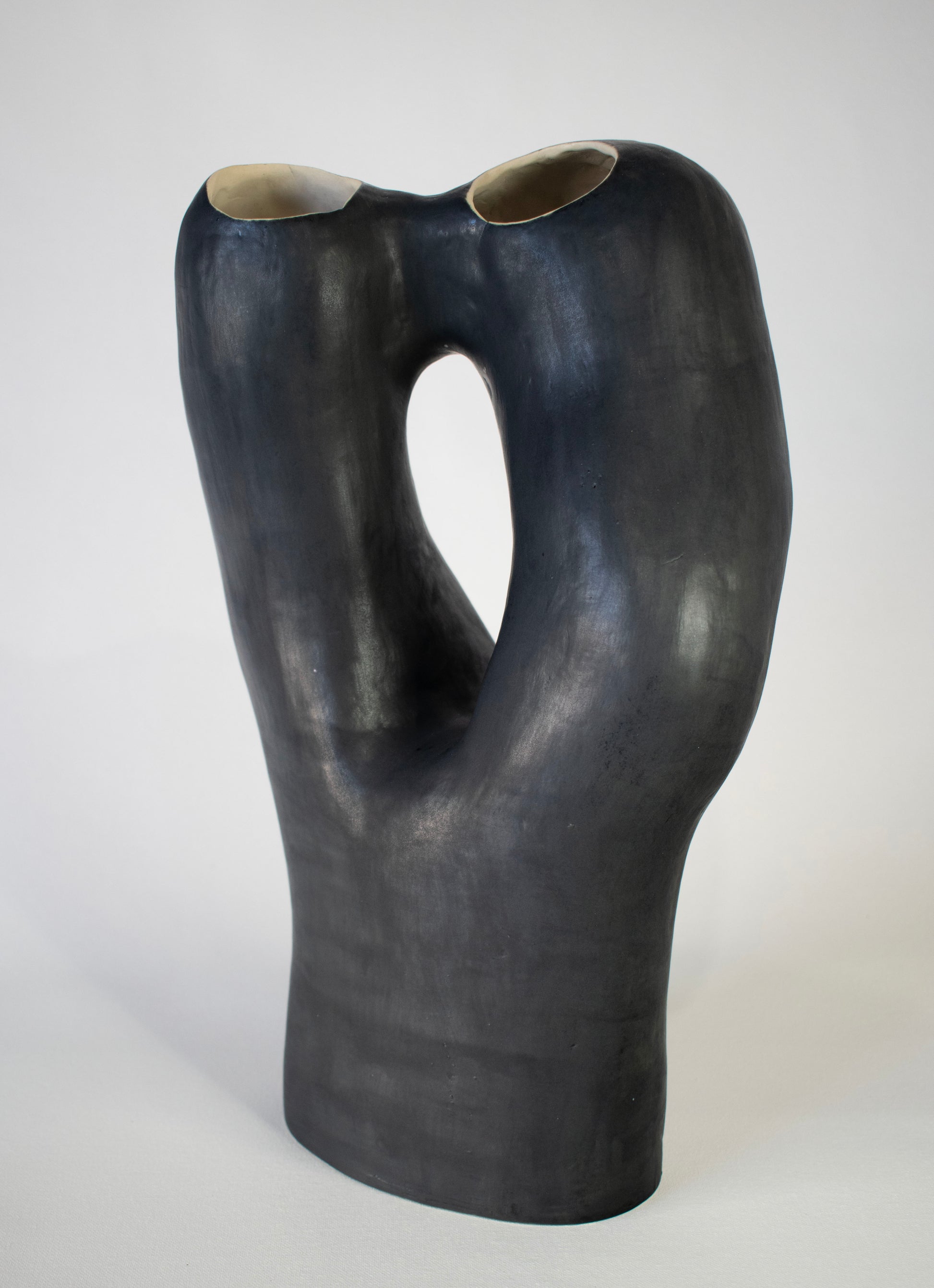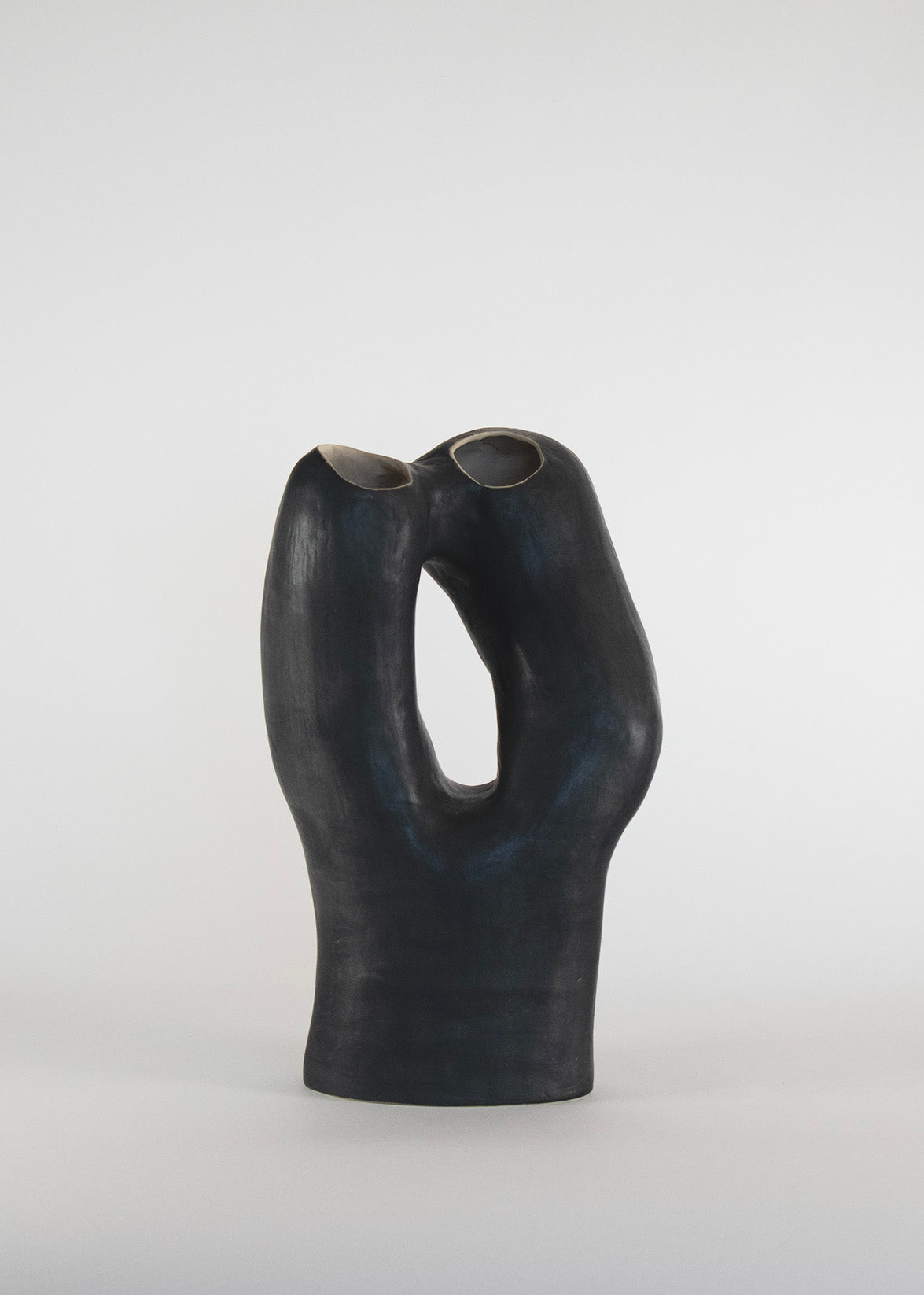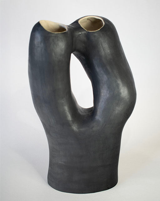 Interlude is sculpted with white stoneware coils and glazed in matte black. Its interior is glazed clear. Watertight. Its shape is organic, imperfections are expected.