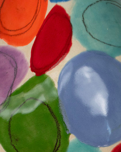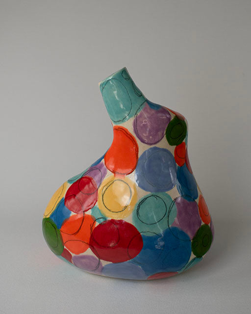 I Like the Way She Moves Vessel is bold with graceful shoulders and a slim neckline. She was coil-built with white stoneware clay and dances with color. Highlighted with irregular, black circles, the colors are glossy. The interior is glazed clear. Watertight.