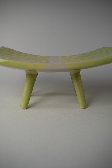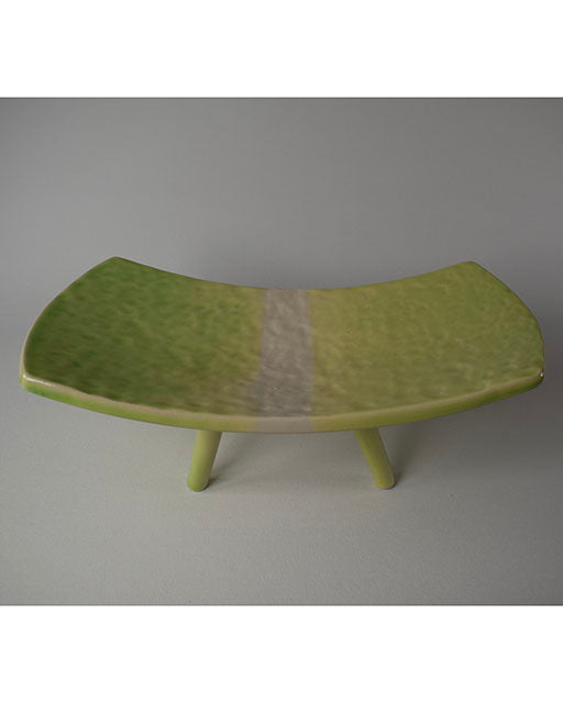 The Sloop - Green has a shallow, curved platform and spindle legs. The surface is dappled with fingerprint indentations. The clear stripe in the center with green glaze on the ends offers a visual break that emphasizes the curvature of the form. Perfect for placing small objects or as a minimalist centerpiece. Handbuilt with white stoneware clay. Food safe.